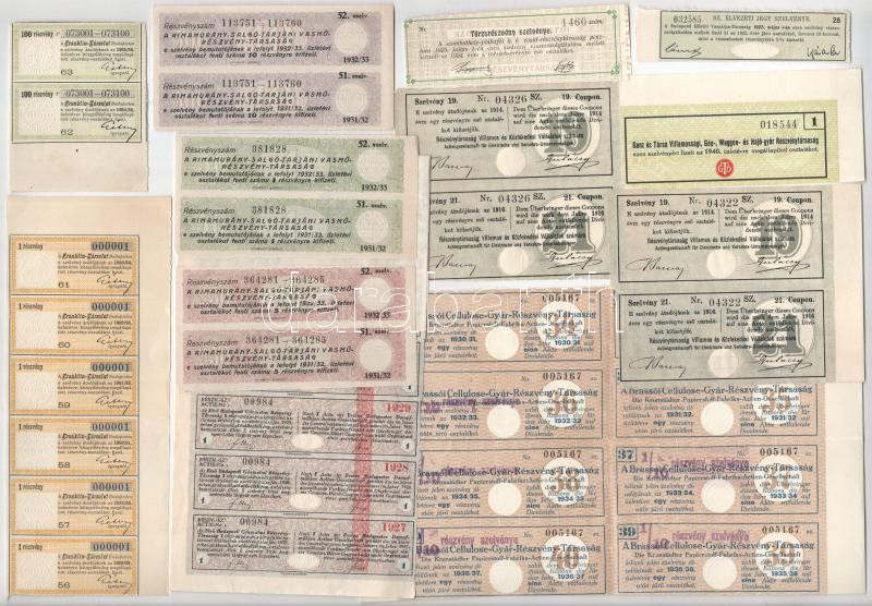 12db klf részvény szelvénye, benne "Részvénytársaság Villamos és Közlekedési Vállalatok számára", "Budapesti Közúti Vaspálya Társaság", "Szombathelyi-Pinkafői Helyiérdekű Vasút", "Brassói Cellulose Gyár-Részvény-Társaság", "Franklin Társulat", "Rimamurány-Salgótarjáni Vasmű Részvény-Társaság", "Ganz és Társa Villamossági, Gép-, Waggon- és Hajó-gyár Részvénytársaság", "Első Budapesti Gőzmalom Részvénytársaság"