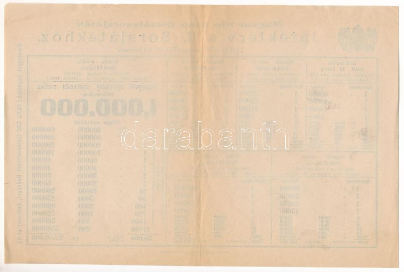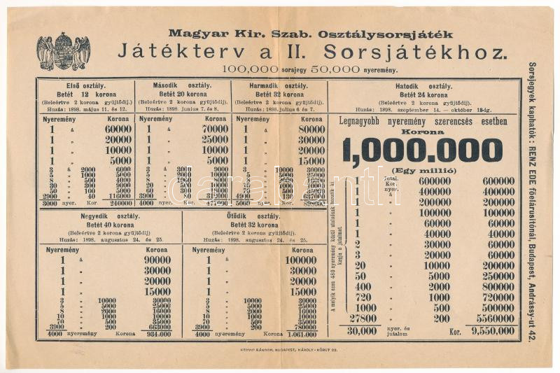 1898. "Magyar Kir. Szab. Osztálysorsjáték - Játékterv a II. Sorsj... https://www.darabanth.com/hu/472-Gyorsarveres/472.0/Numizmatika/Reszvenyek-es-sorsjegyek~2000006/1898-Magyar-Kir-Szab-Osztalysorsjatek-Jatekterv-a-II-Sorsjatekhoz-nyomtatvany-TF-sz~II3184478
