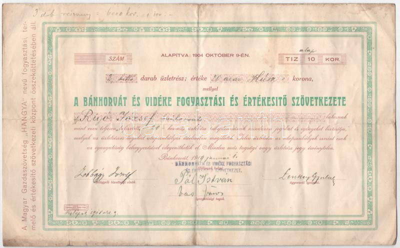Leírás: Bánhorvát 1919. "Bánhorvát és Vidéke Fogyasztási és Értékesítő Szövetkezete" 2db üzletrésze 20K-ról T:F erősen szennyezett