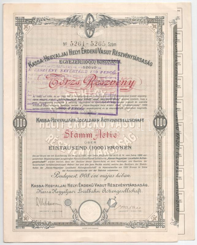 Budapest 1908. "Kassa-Hegyaljai Helyi Érdekű Vasút Részvénytársaság" törzsrészvénye 1000K-ról, magyar és német nyelven, felülbélyegzéssel, szárazpecséttel, vízjeles papíron T:AU / Hungary / Budapest 1908. "Kassa-Hegyaljai Helyi Érdekű Vasút Részvénytársaság" share about 1000 Korona, Hungarian-German bilingual, with cancellation, embossed stamp and watermarked paper C:AU