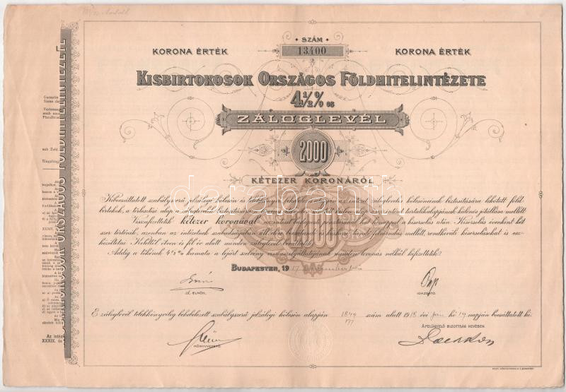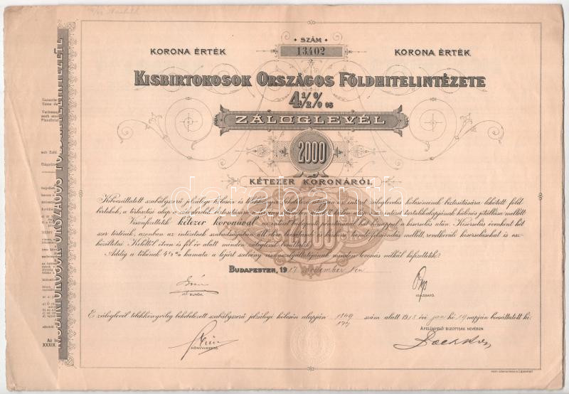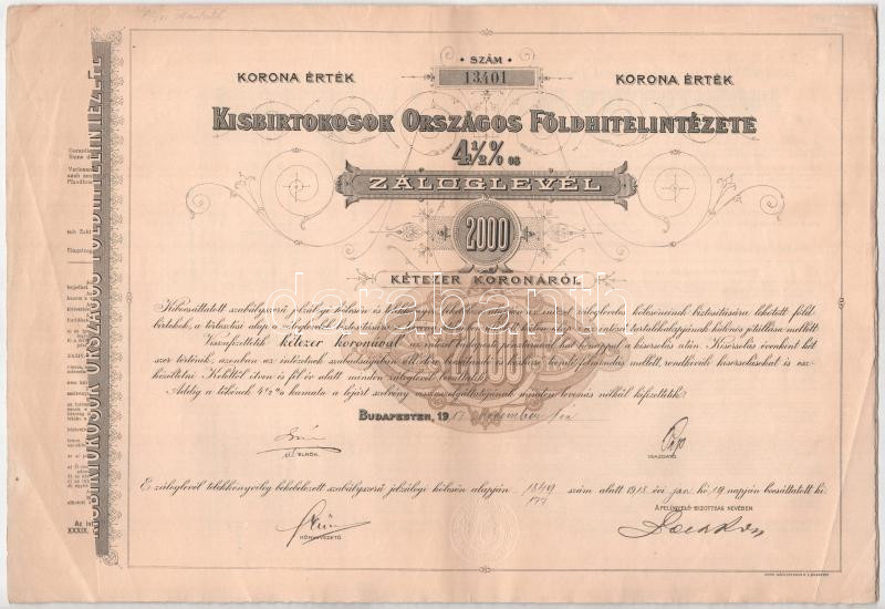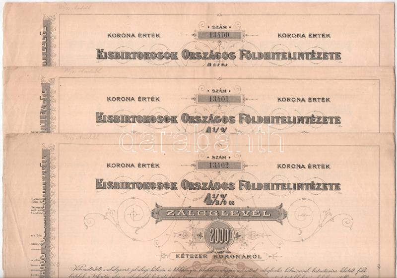 Budapest 1917. "Kisbirtokosok Országos Földhitelintézete" 4 1/2%-os záloglevele 200K-ról, magyar, német és francia nyelven, szárazpecséttel, szelvényekkel (3x) sorszámkövetők "13.400 - 13.402" T:F szép papír