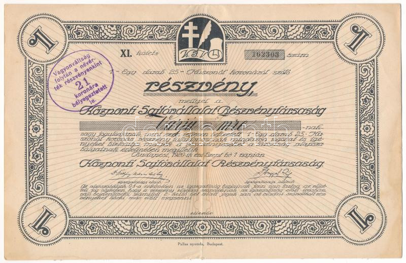 Leírás: Budapest 1920. "Központi Sajtóvállalat Részvénytársaság" részvénye 25K-ról, felülbélyegzéssel és szelvényekkel T:VF