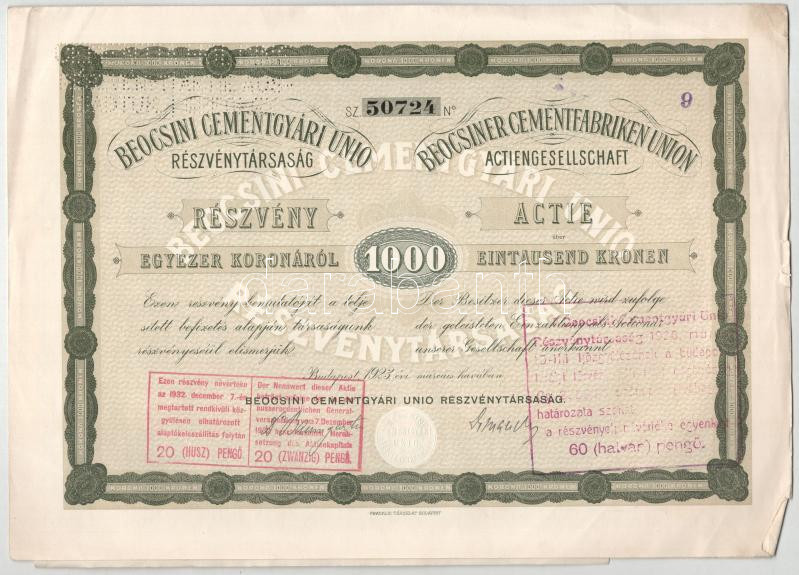 Budapest 1923. "Beocsini Cementgyári Unió Részvénytársaság" részvénye 1000K-ról, magyar és német nyelven, szelvényekkel, bélyegzésekkel, szárazpecséttel, perforált "CEMENTIA HOLDING RÉSZVÉNYT KIADTUK" felirattal T:XF,VF több kisebb hajtás, széleken szakadás