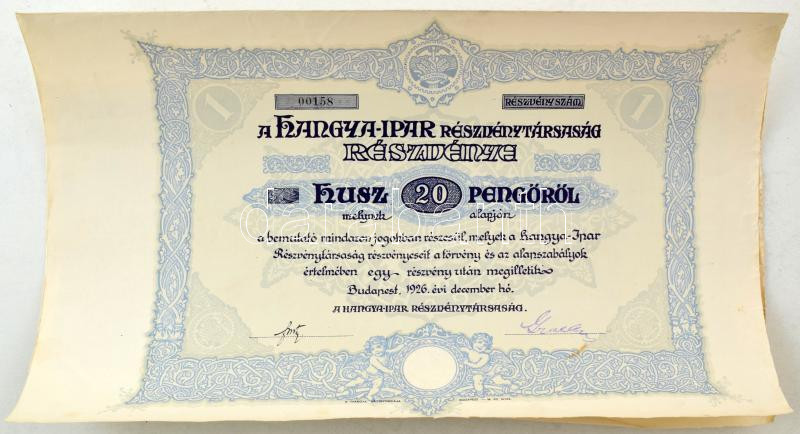 Leírás: Budapest 1926. "A Hangya-Ipar Részvénytársaság" részvénye 20P-ről "00158" sorszámmal, szárazpecséttel, felülbélyegzésekkel, szelvényekkel T:XF hajtatlan, kisebb beszakadások, gyűrődések, folt