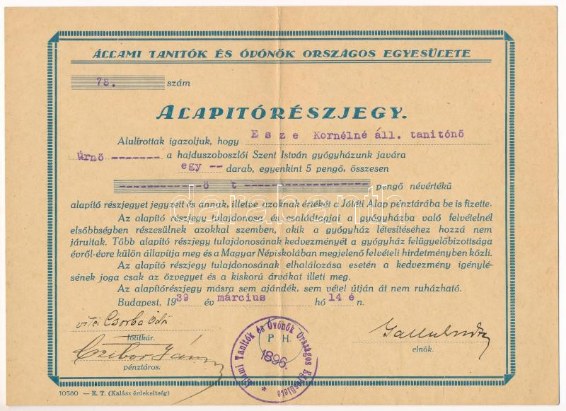 Budapest 1939. "Állami Tanítók és Óvónők Országos Egyesülete"... https://www.darabanth.com/hu/472-Gyorsarveres/472.0/Numizmatika/Reszvenyek-es-sorsjegyek~2000006/Budapest-1939-Allami-Tanitok-es-Ovonok-Orszagos-Egyesulete-alapitoreszjegye-5P-erte~II3201463