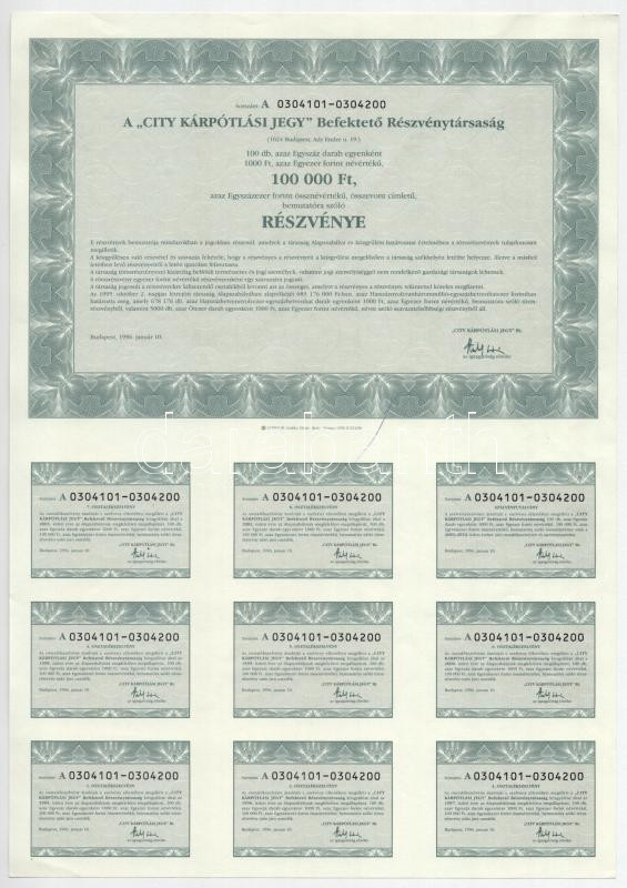 Leírás: Budapest 1996. "A City Kárpótlási Jegy Befektető Részvénytársaság" 1000Ft értékű részvénye, szelvényekkel T:XF