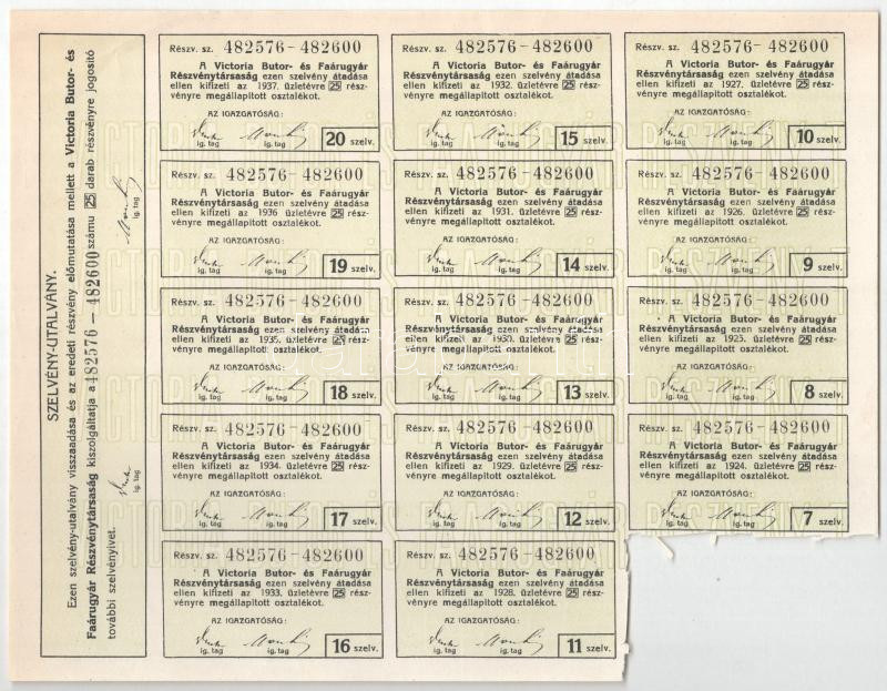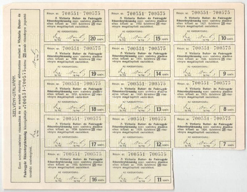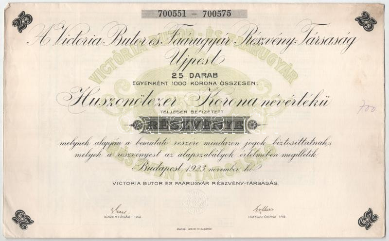 Budapest / Újpest 1923. "A Victoria Bútor és Faárugyár Részvénytársaság" 25db részvénye egyben, egyenként 1000K-ról, szárazpecséttel, bélyegzéssel, szelvényekkel (2x) T:XF