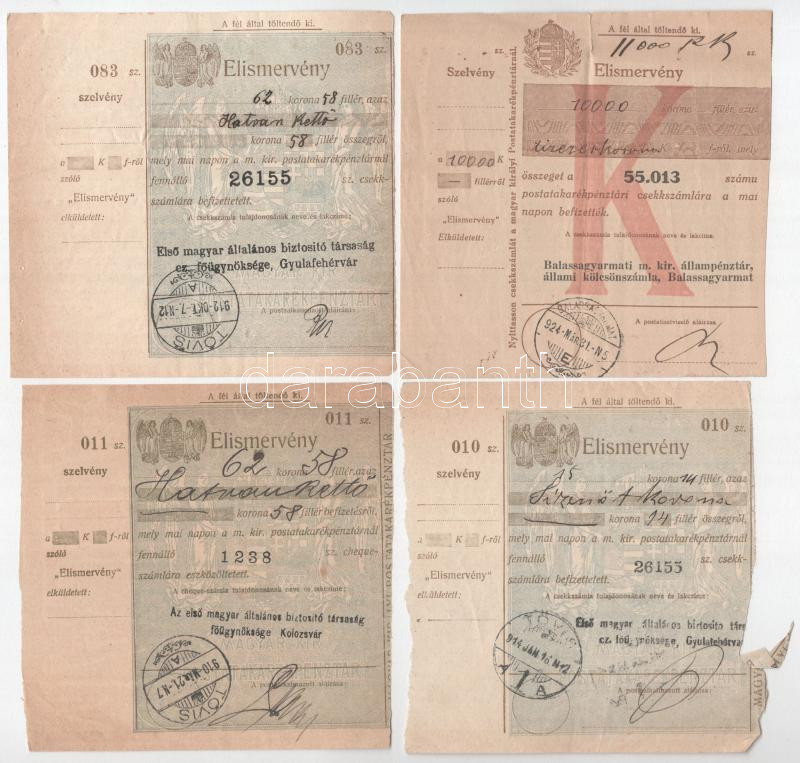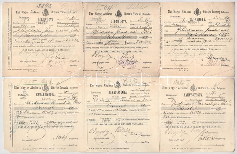 Leírás: Kolozsvár ~1910. "Első Magyar Általános Biztosító Társaság" kitöltött díj-nyugta (3x) + kitöltött kamat-nyugta (3x) + Gyulafehérvár / Kolozsvár 1910-1914. "Első Magyar Általános Biztosító Társaság Főügynöksége, Gyulafehérvár / Kolozsvár" elismervény (3x) + Balassagyarmat 1924. "Balassagyarmati Magyar Királyi Állampénztár" elismervény T:VF,F