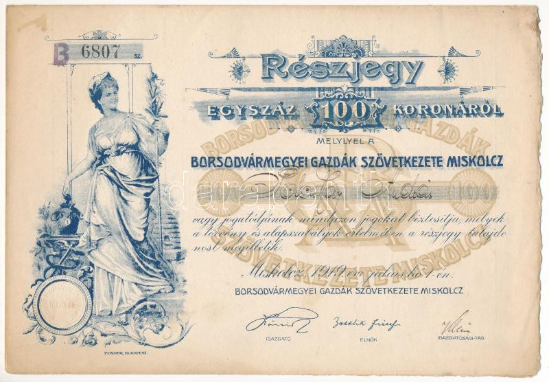 Miskolc 1919. "Borsodvármegyei Gazdák Szövetkezete Miskolcz"... https://www.darabanth.com/hu/472-Gyorsarveres/472.0/Numizmatika/Reszvenyek-es-sorsjegyek~2000006/Miskolc-1919-Borsodvarmegyei-Gazdak-Szovetkezete-Miskolcz-nevre-szolo-reszjegye-100K-rol-~II3175299