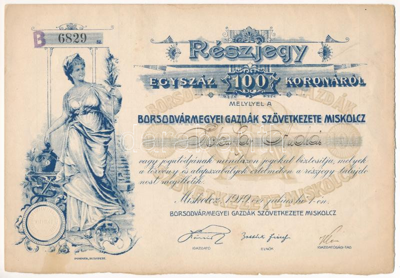 Miskolc 1919. "Borsodvármegyei Gazdák Szövetkezete Miskolcz"... https://www.darabanth.com/hu/472-Gyorsarveres/472.0/Numizmatika/Reszvenyek-es-sorsjegyek~2000006/Miskolc-1919-Borsodvarmegyei-Gazdak-Szovetkezete-Miskolcz-nevre-szolo-reszjegye-100K-rol-~II3179935