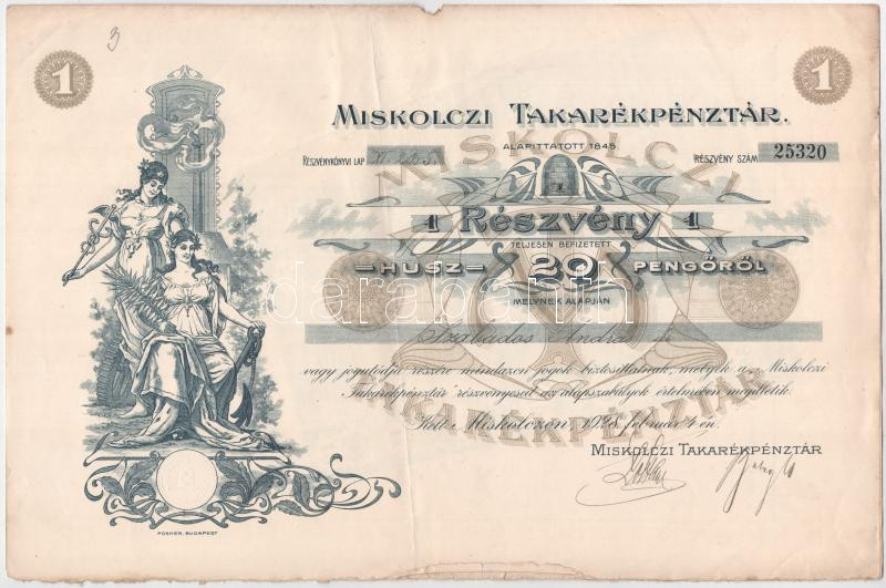 Leírás: Miskolc 1926. "Miskolczi Takarékpénztár" részvénye 20P-ről szelvényekkel T:F foltos