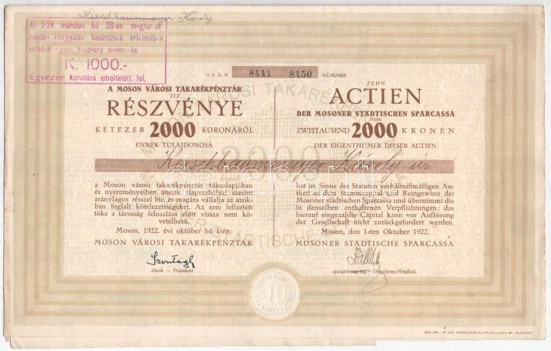 Leírás: Moson 1922. "A Moson városi Takarékpénztár" 10 részvénye egyben, 2000K-ról, szárazpecséttel, szelvényekkel, felülbélyegzéssel T:AU,XF hajtatlan