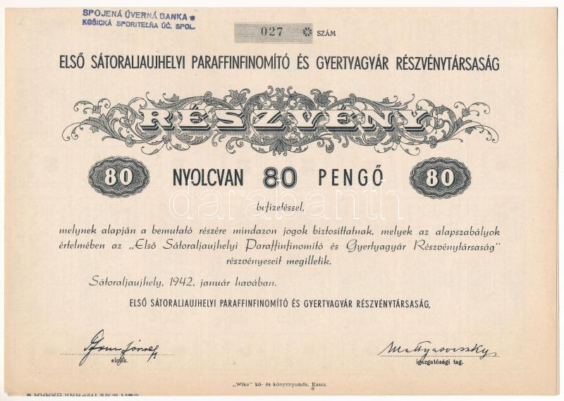Sátoraljaújhely 1942. "Első Sátoraljaújhelyi Paraffinfinomító és ... https://www.darabanth.com/hu/472-Gyorsarveres/472.0/Numizmatika/Reszvenyek-es-sorsjegyek~2000006/Satoraljaujhely-1942-Elso-Satoraljaujhelyi-Paraffinfinomito-es-Gyertyagyar-Reszvenytar~II3179940