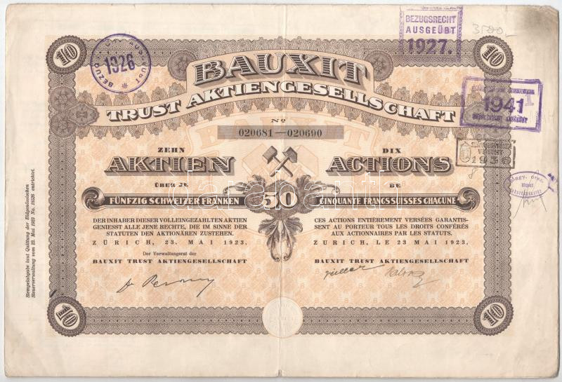 Svájc / Zürich 1926. "Bauxit Tröszt Részvénytársaság" 5db részvénye egyenként 50Fr-ról bélyegzésekkel, szelvényekkel, szárazpecséttel, perforációval T:F