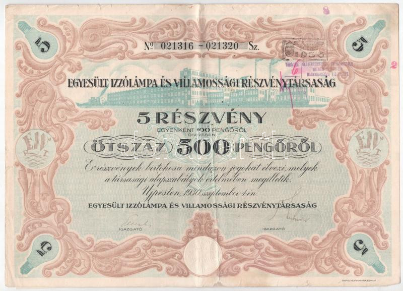 Újpest 1930. "Egyesült Izzólámpa és Villamossági Részvénytársaság" 5 részvénye egyben, összesen 500P-ről, szárazpecséttel, szelvényekkel, felülbélyegzéssel T:F,VG szakadás, folt, egy részen ragasztva