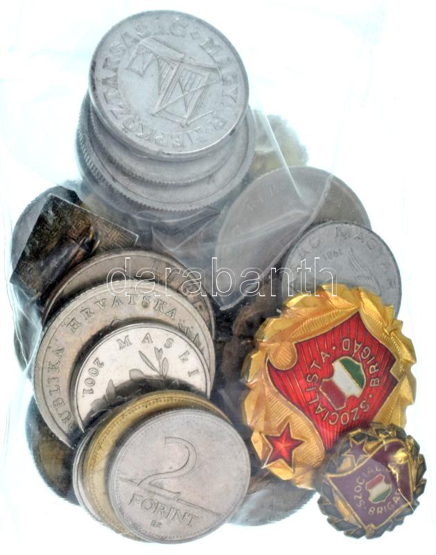 Leírás: 29db-os vegyes magyar és külföldi fémpénz, szocialista jelvény tétel T:AU-VF