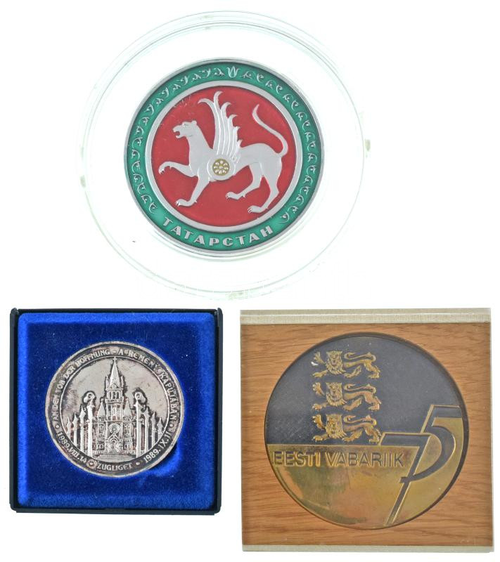 3db-os magyar és külföldi emlékérem-tétel, benne: 1989. "A remény kapujában - Zugliget" kétoldalas ezüstözött fém emlékérem (42mm) + Észtország 1993. "Az Észt Köztársaság kikiáltásának 75. évfordulója" egyoldalas bronz emlékérem tokban + Oroszország / Tatárföld DN "Tatársztán / Emlékmedál" Al emlékérem kapszulában, egyik oldala festett (60mm) T:AU,XF