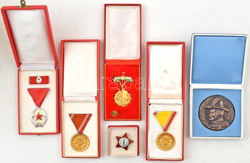 Vegyes 6db-os szocialista kitüntetés, jelvény és plakett tétel mind eredeti tokban, közte: 1964. "A Magyar Munka Érdemrend ezüst fokozata", ~1970. "Kiváló Termelőszövetkezeti Dolgozó", "Bem József Ált. Iskola Balatonfüred" egyoldalas bronz plakett T:AU,XF
