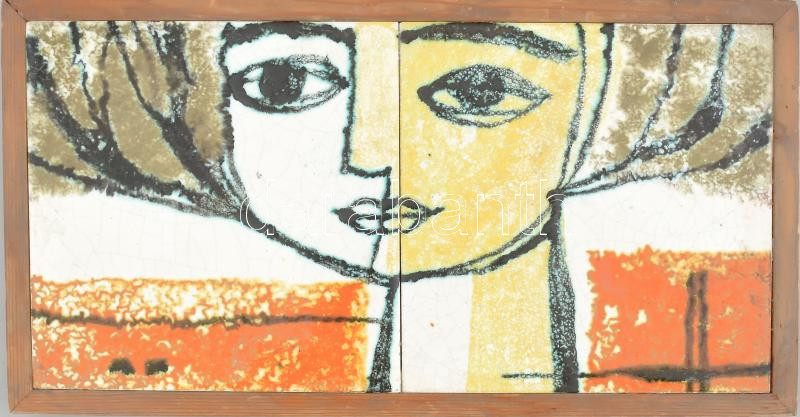 Leírás: Majoros János: Női arc. 2 darab csempéből álló kép, fakeretben, kis lepattanással, csempék együtt 15x30 cm