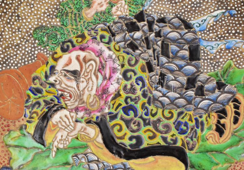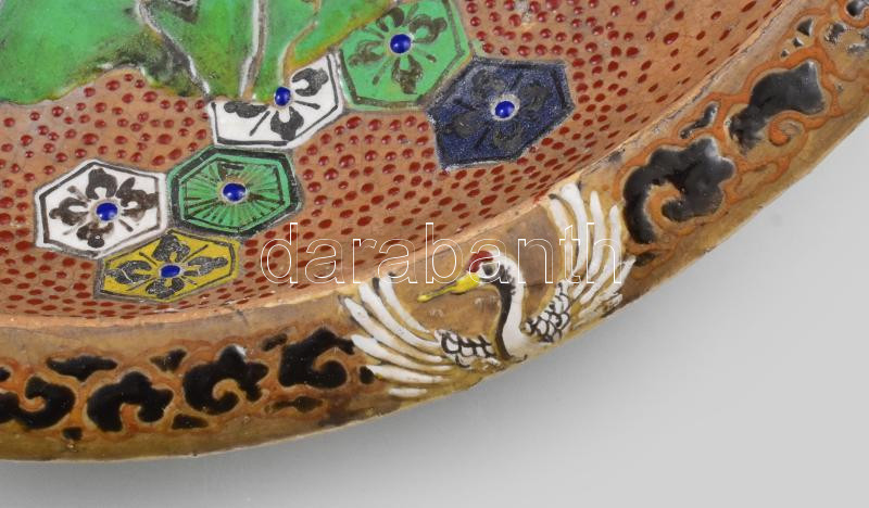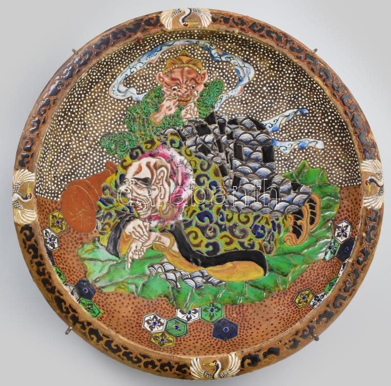 Leírás: cca 1900 Satsuma nagy méretű kerámia dísztál, préselt és festett mintával, jelzés nélkül, kis kopottsággal, d: 36 cm