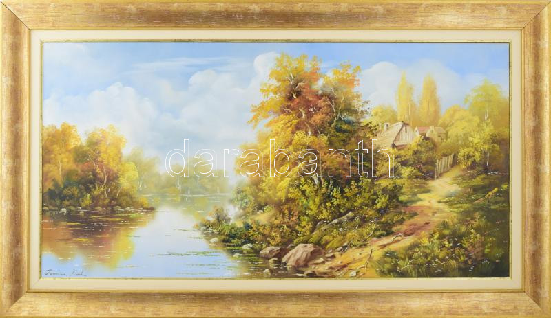 Leírás: Teodor Mark: A természet ölén. Olaj, vászon, dekoratív keretben, kereten kis sérüléssel 50x100 cm tanúsítvánnyal