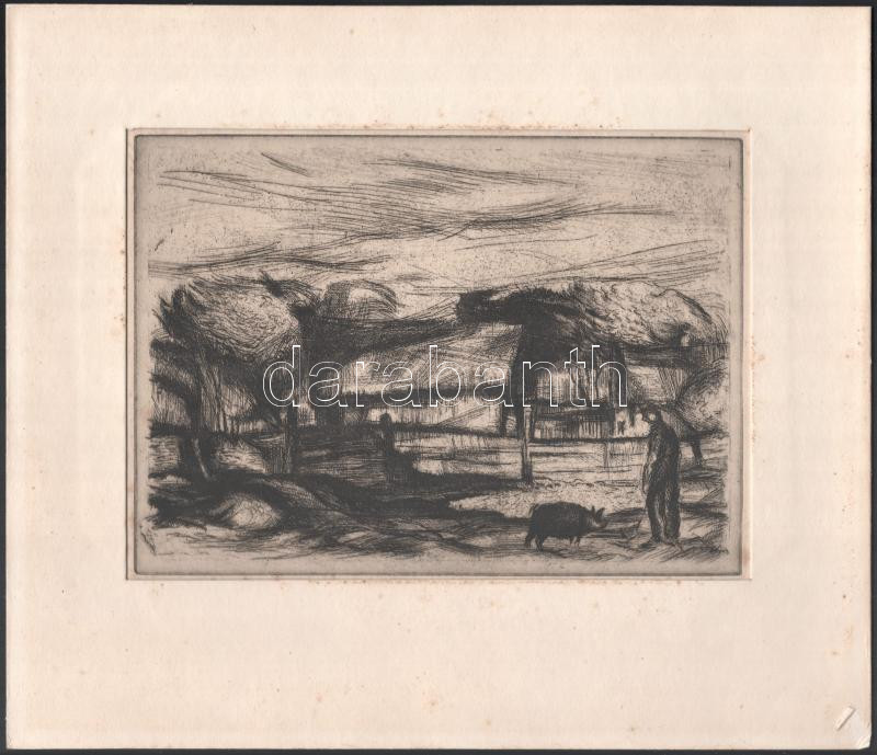 Leírás: Boross Géza (1908-1971): Malac pásztorral. Rézkarc, papír, jelzés nélkül, paszpartuban. 17x23 cm