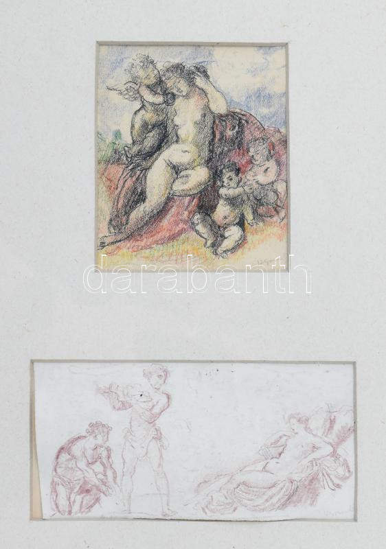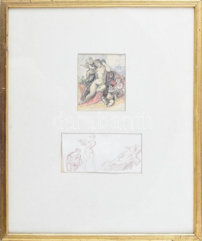 Herman Lipót (1884-1972), 2 db rajz egy keretben: Női akt puttókkal és jelenet női akttal. Ceruza, papír, mindkettő jelezve jobbra lent, üvegezett fakeretben, hátoldalán Herman Lipót hagyatéki bélyegzővel, 10,5x8 és 7x14,5 cm