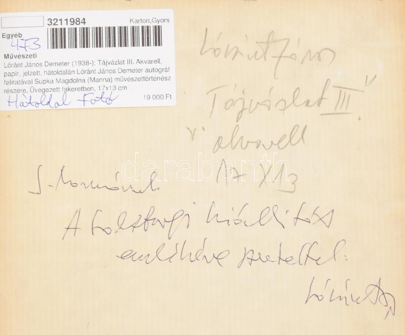 Lóránt János Demeter (1938-): Tájvázlat III. Akvarell, papír, jelzett,... https://www.darabanth.com/hu/473-Gyorsarveres/473.0/Festmenyek-es-grafikak/Festmenyek-es-grafikak~500003/Lorant-Janos-Demeter-1938-Tajvazlat-III-Akvarell-papir-jelzett-hatoldalan-Lorant-J~II3211984