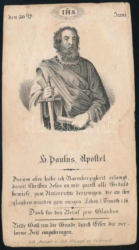 cca 1750 Szent Pál apostolt ábrázoló kőnyomatos, litografált szentkép ... https://www.darabanth.com/hu/473-Gyorsarveres/473.0/Festmenyek-es-grafikak/Metszetek~500005/cca-1750-Szent-Pal-apostolt-abrazolo-konyomatos-litografalt-szentkep-8x15-cm~II3202637