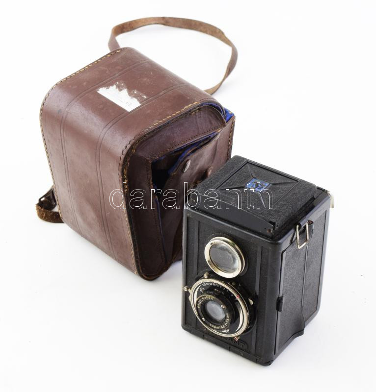 Leírás: cca 1932 Voigtländer Brillant 6x6-os TLR fényképezőgép f: 4,5, f: 7,5 objektívvel, sérült, bőr tokjával, kissé kopottas.