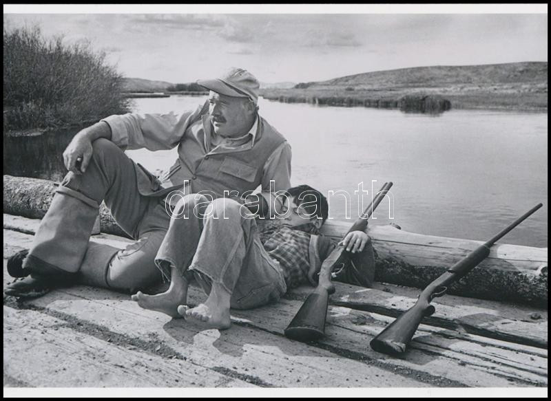 1941 Robert Capa (1913-1954) (eredeti neve Friedmann Endre) magyar - francia fotóriporter felvétele: ,,Ernest Hemingway (1899-1961) amerikai író és a fia vadászaton", a néhai FOTÓ újság (1954-1989) archívumából 1 db modern nagyítás, jelzés nélkül, 15x21 cm