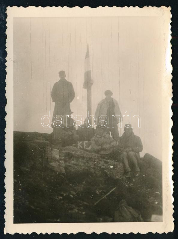 Leírás: 1941 Ünőkő csúcs a Radnai-havasokban, Erdélyben a visszaszerzés utáni első évfordulókor új zászló cseréjével, hátoldalon feliratozott fotó, 8×6 cm