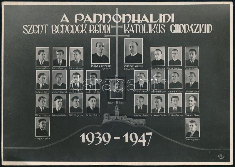1947 A Pannonhalmi Szent Benedek-rendi Katolikus Gimnázium 1939-1947, tablófotó, a hátoldalon aláírásokkal (,,a pannonhalmi gimnázium első érettségizői"), 17,5x12,5 cm