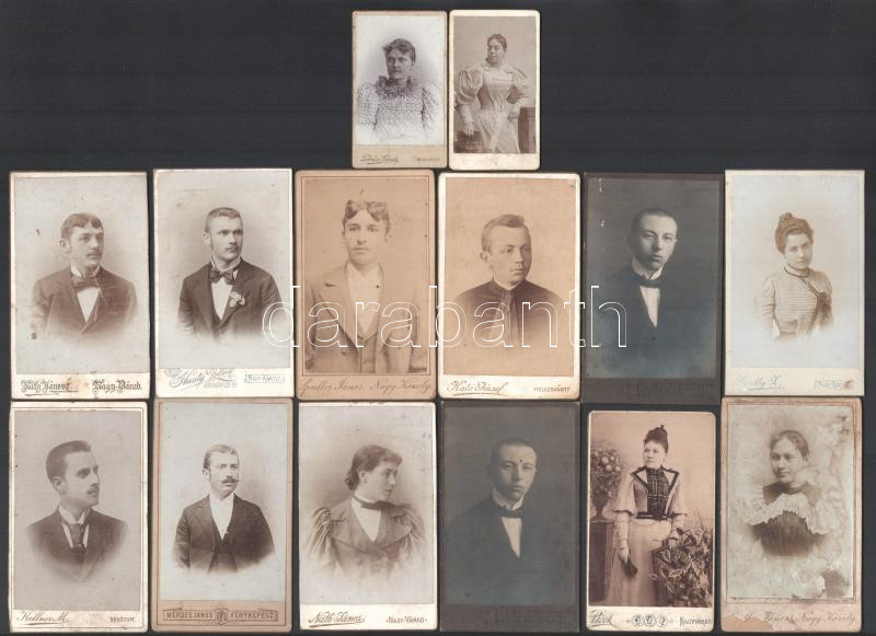 Vegyes fotó tétel, vízitkártyák, nagyrészt erdélyi műtermekből (Nagyvárad, Kolozsvár, NagyKároly), de közte kb. itthoniak is, 14 db, 7,5×4,5 és 10,5×6,5 cm közötti méretekben