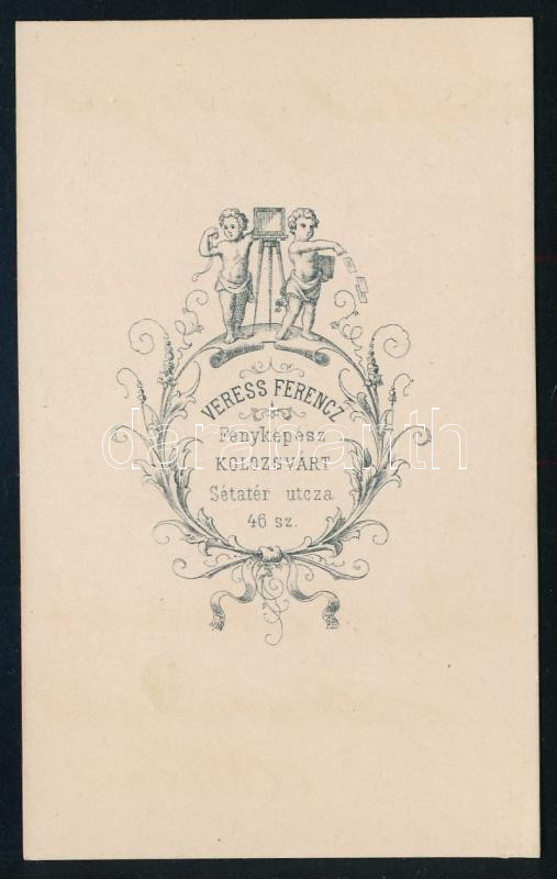 Leírás: cca 1860 Előkelő férfi arcképe, keményhátú fotó Veress Ferenc kolozsvári műterméből, hátlapján puttókkal és fényképezőgéppel illusztrált, 10,5x6 cm