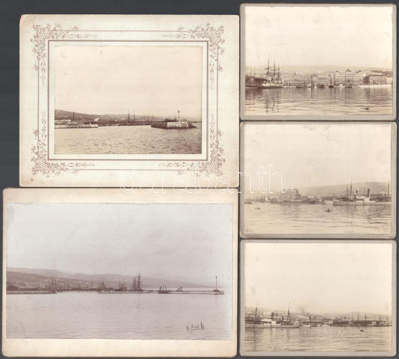 Leírás: cca 1910 Fiume, 5 db keményhátú fotó, a képeken a Rudolf-móló, a Mária Valéria-móló és a Zichy-móló is látható. Változó méretben.