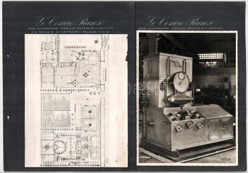cca 1920-1930 G[iulio] Cesare Ranzi leganói gyárának dinamométerének fotói [Freni dinamometri idraulici reversibili (brevettati.)] 2 db fotó feliratozott kartonon, az egyik foltos, 23x17 cm