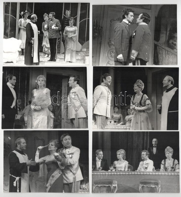 cca 1968 6 db fotó magyar színészekről: Dózsa László, Bencze Ilona, Márkus László, Szemere Vera, Pécsi Sándor, Tolnay Klári és mások "A hattyú" című vígjátékban, 12×9 cm