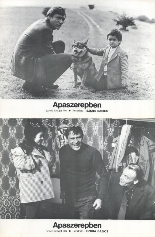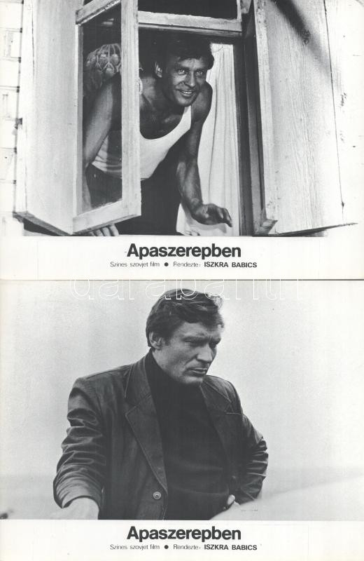 cca 1989 előtt készült, ,,Apa szerepben" című szovjet film jelenetei és szereplői, 6 db produkciós filmfotó (vitrinfotó, lobbyfotó) nyomdatechnikával sokszorosítva kartonpapírra, egyoldalas nyomással, a használatból eredő (esetleges) kisebb hibákkal, 18x24 cm