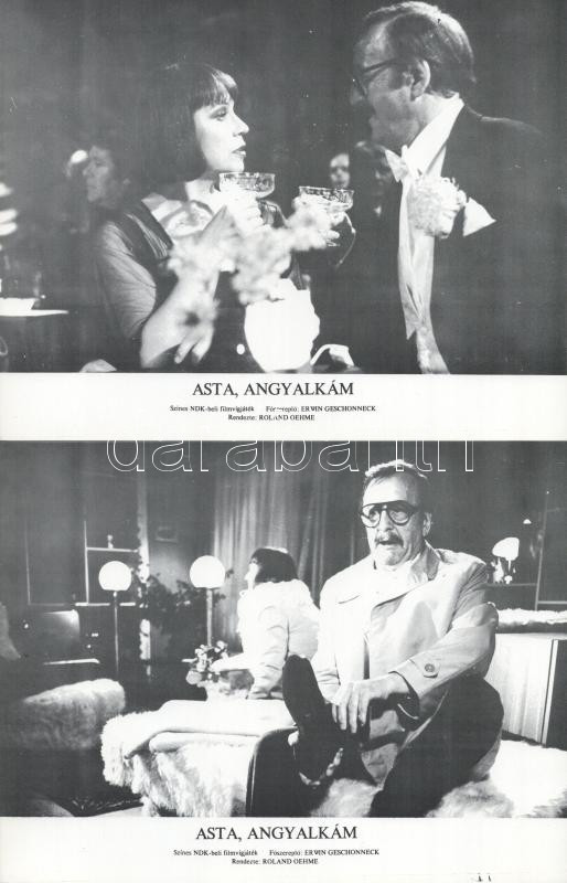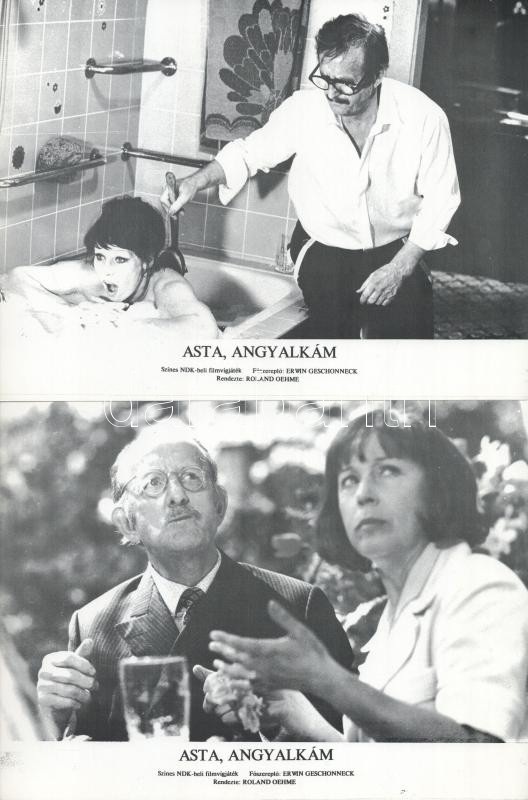 cca 1989 előtt készült, ,,Asta, angyalkám" című NDK-beli film jelenetei és szereplői, 8 db produkciós filmfotó (vitrinfotó, lobbyfotó) nyomdatechnikával sokszorosítva kartonpapírra, egyoldalas nyomással, a használatból eredő (esetleges) kisebb hibákkal, 18x24 cm