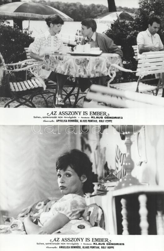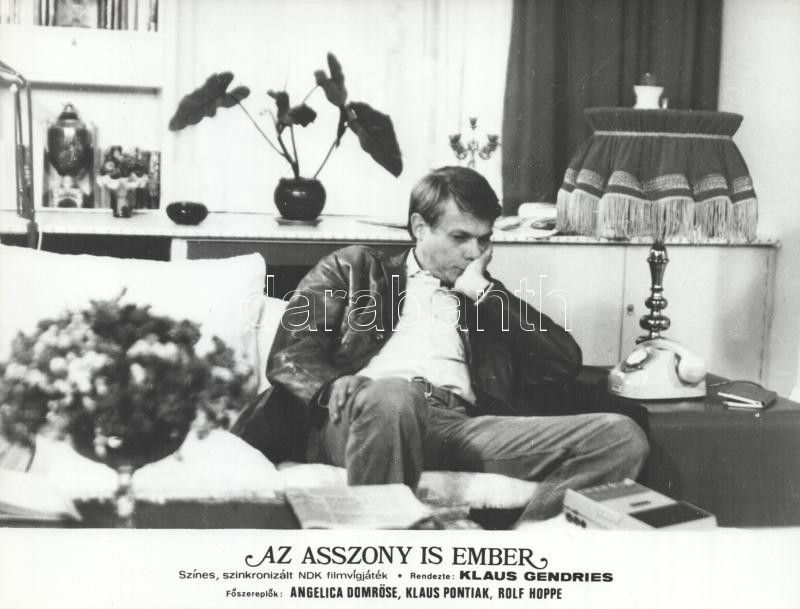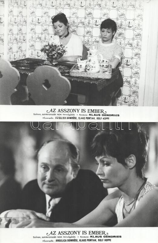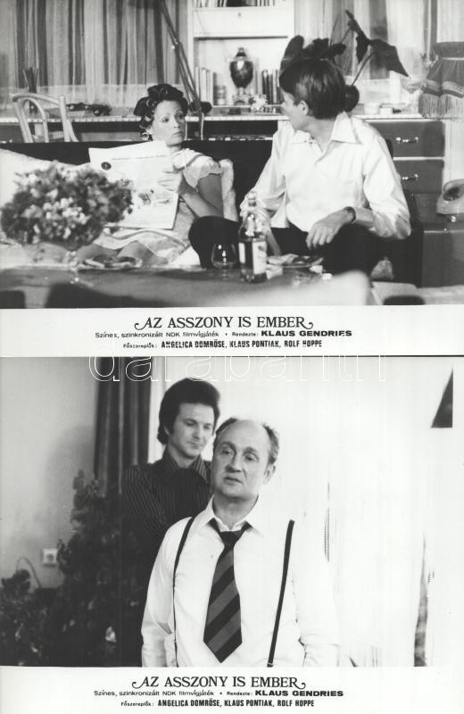 cca 1989 előtt készült, ,,Az asszony is ember" című NDK-beli film jelenetei és szereplői, 7 db vintage produkciós filmfotó (vitrinfotó, lobbyfotó) ezüst zselatinos fotópapíron, a használatból eredő (esetleges) kisebb hibákkal, 18x24 cm