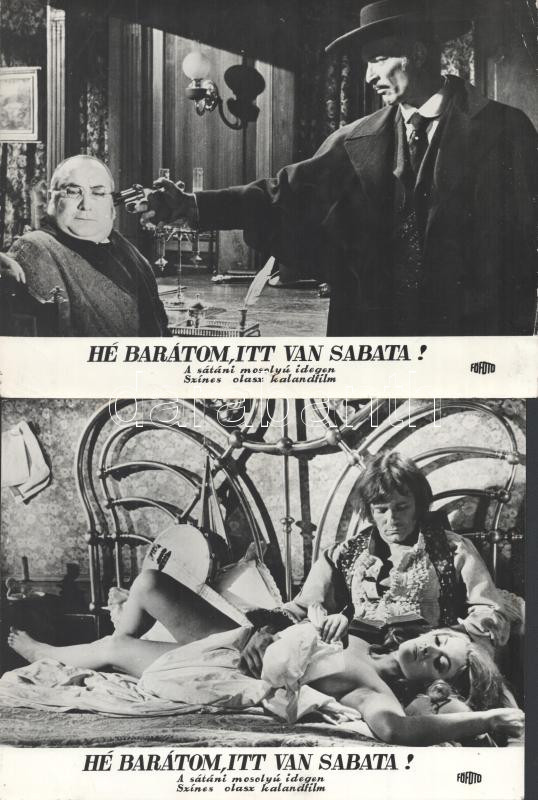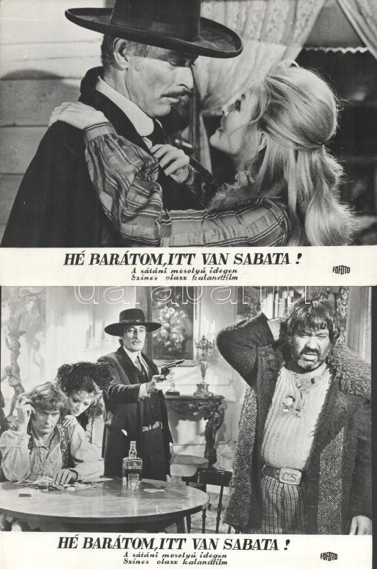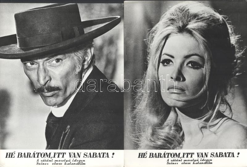cca 1989 előtt készült, ,,Hé barátom, itt van Sabata" című olasz westernfilm jelenetei és szereplői, 14 db vintage produkciós filmfotó (vitrinfotó, lobbyfotó) ezüst zselatinos fotópapíron, a használatból eredő (esetleges) kisebb hibákkal, 18x24 cm