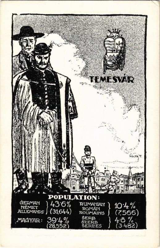 Temesvár, Timisoara; Magyar, német,román (oláh) és szerb nemzetiségek népesség aránya. Címer, Pátria rt. kiadása / Percentage of Hungarian, German, Romanian and Serbian population. Irredenta art postcad with coat of arms s: Pólya Tibor (EK)