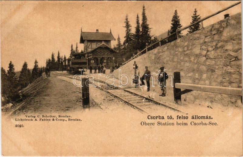 Tátra, Magas-Tátra, Vysoké Tatry; Csorba-tó, fogaskerekű vasút felső állomása, vonat. Verlag C. Schröter. Lichtdruck A. Fabian & Comp. / Obere Station beim Csorba-See / Strbské pleso / cogwheel railway station, train (EK)