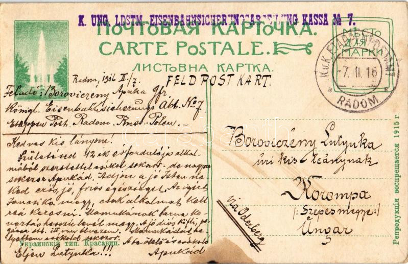 Leírás: 1916 Ukrainian folklore + "K. ung. Ldstm. Eisenbahnsicherungsabteilung Kassa No. 7." "K.U.K. ETAPPENPOSTAMT RADOM" (fl)