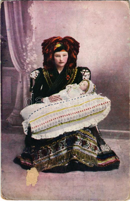 Leírás: Mezőkövesdi népviselet, matyó asszony csecsemővel. Balázs Ferenc kiadása / Hungarian folklore (ázott / wet damage)