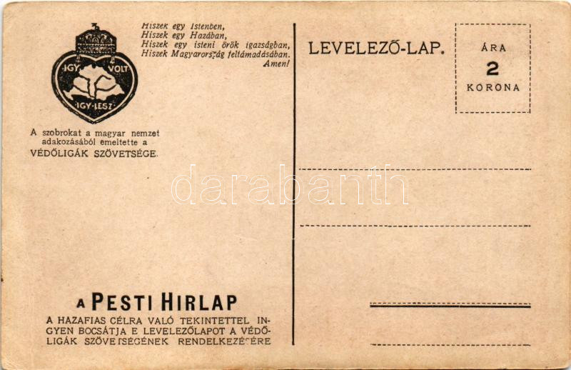 Csonka Magyarország nem ország. Egész Magyarország mennyország. Trianon szoborcsoport (Budapest), irredenta propaganda. "Észak" szobra (Kisfaludy Strobl Zsigmond szobrászművész alkotása) A szobrokat a magyar nemzet adakozásából emeltette a Védőligák Szövetsége. Pesti Hírlap kiadása / Hungarian irredenta propaganda, monument (EB)