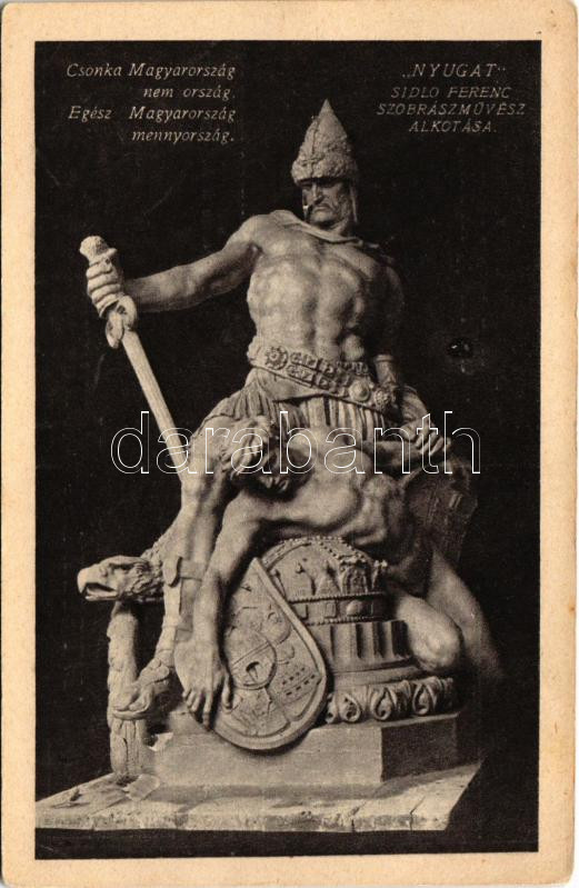 Csonka Magyarország nem ország. Egész Magyarország mennyország. Trianon szoborcsoport (Budapest), irredenta propaganda. "Nyugat" szobra (Sidló Ferenc szobrászművész alkotása) A szobrokat a magyar nemzet adakozásából emeltette a Védőligák Szövetsége. Pesti Hírlap kiadása / Hungarian irredenta propaganda, monument (EK)
