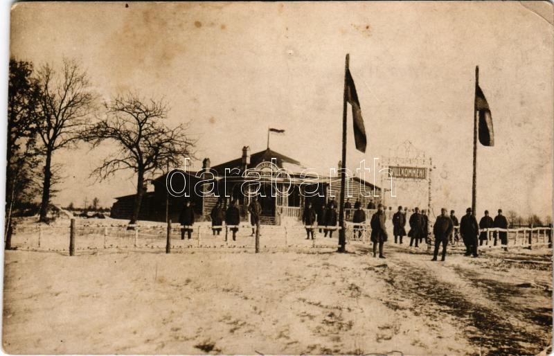 Leírás: 1918 Soldatenheim Kronprinz Otto. Willkommen! / WWI Austro-Hungarian K.u.K. military, group of soldiers. photo (szakadás / tear)