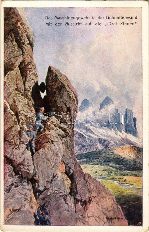 Das Maschinengewehr in der Dolomitenwand mit der Aussicht auf die "Drei Zinnen". Offizielle Karte für Rotes Kreuz, Kriegsfürsorgeamt, Kriegshilfsbüro Nr. 211. / WWI Austro-Hungarian K.u.K. military art postcard, soldiers with machine gun, view of the Drei Zinnen (Tre Cime di Lavaredo, Südtirol) s: Rudolf Kargl (EK)